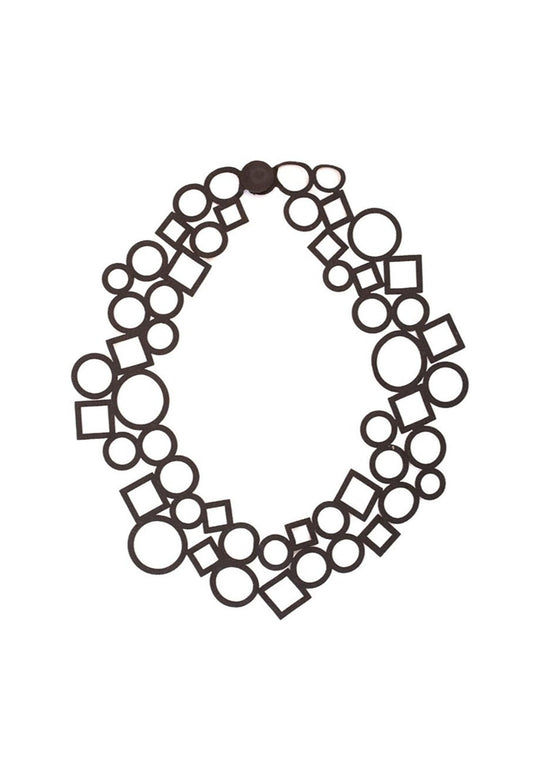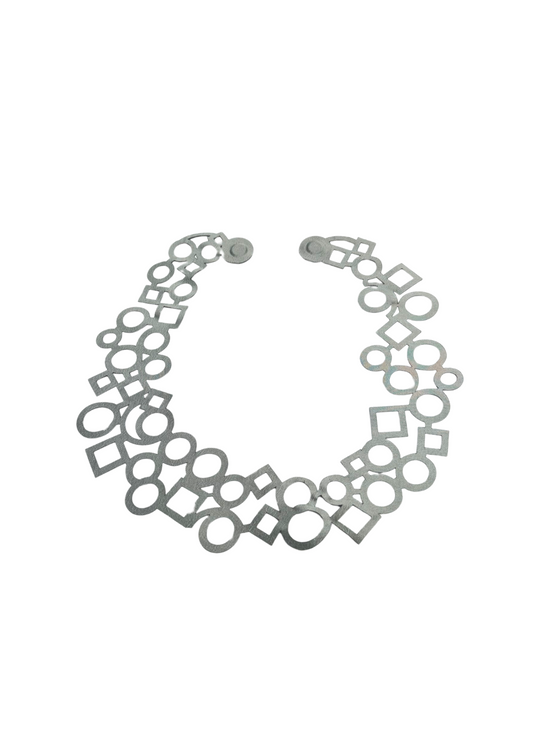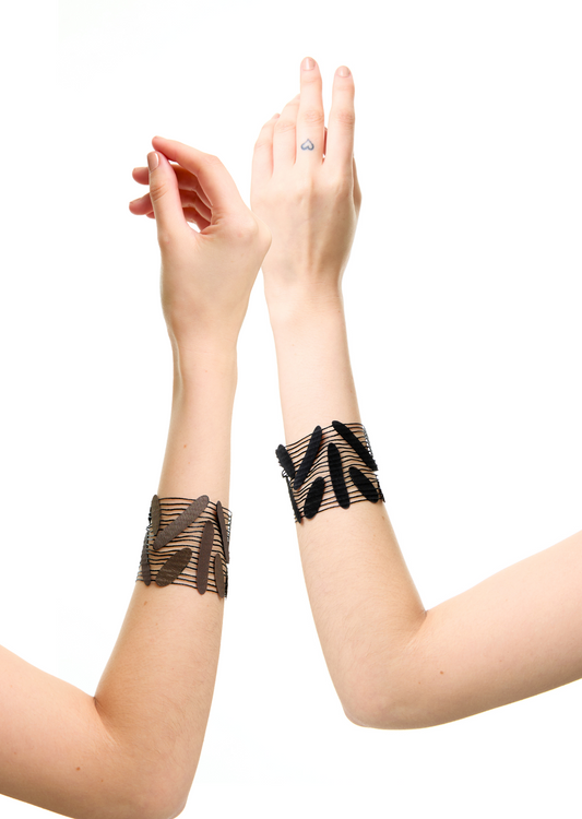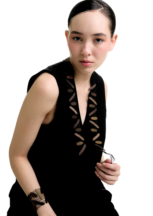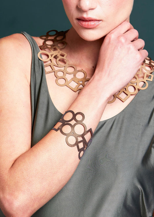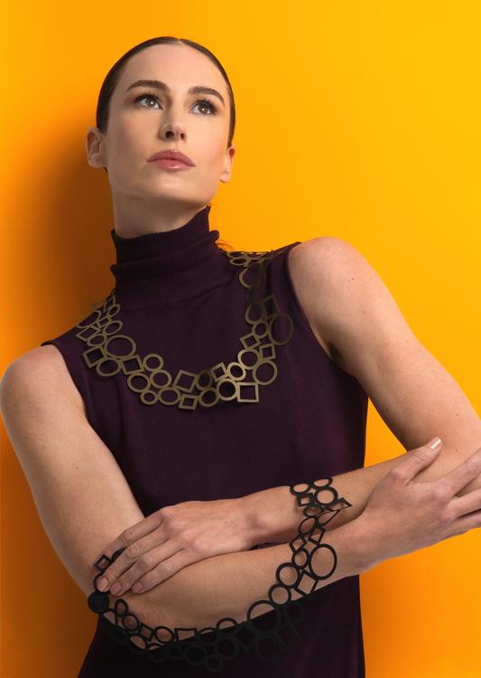 Em suas joias, explora diferentes maneiras de cortar, juntar e dar novos formatos ao tecido, utilizando o corte a laser e montagens que garantem o aproveitamento total do positivo e negativo da matéria-prima.