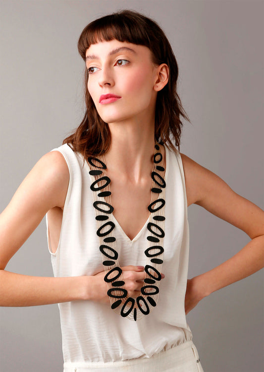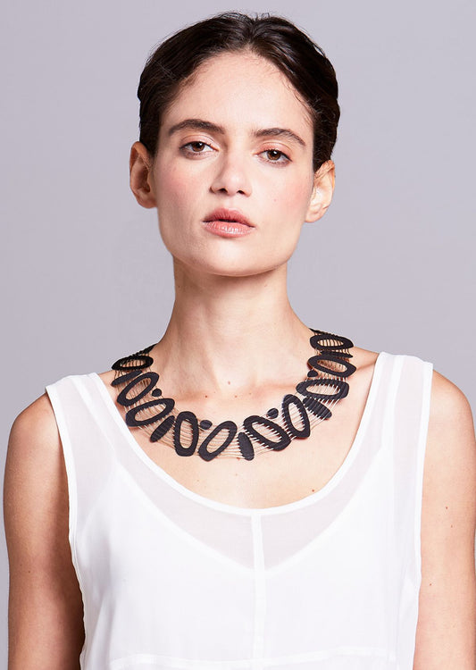 Presença com delicadeza. Essa é a marca registrada desta artista plástica que transita entre a arte, o design e a joalheria e que criou um sistema construtivo que combina técnicas artesanais, industriais e digitais, abrangendo o tear, o crochê, o corte a laser e a impressão 3D.