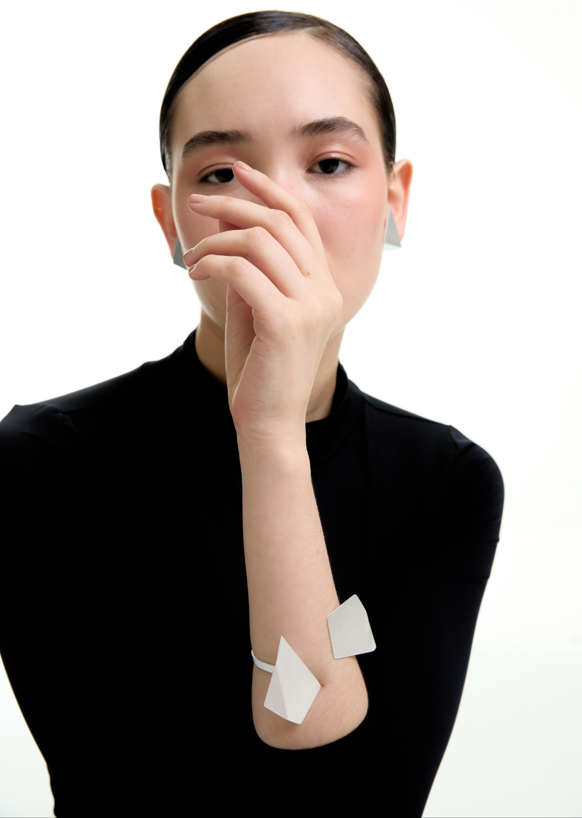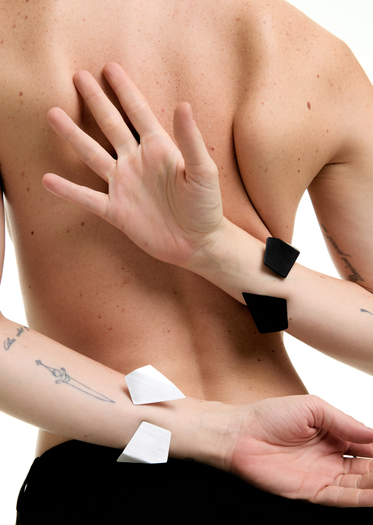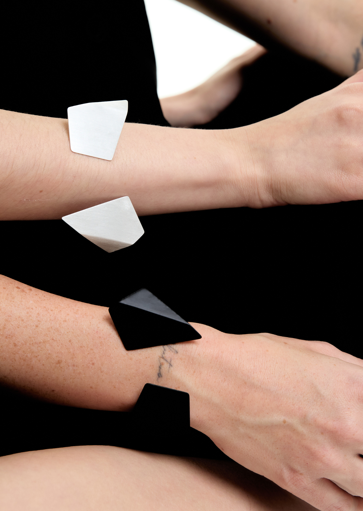 Bracelete impactante feito a partir de duas chapas geométricas rígidas de prata, presas a um aro também de prata, que permite o ajuste à largura do seu pulso ao aproximar ou afastar as chapas. O bracelete integra a linha Vértice e pode ser complementado pelo Anel vértice Duo, pelo Colar...