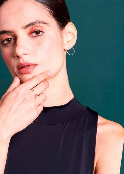 Brinco minimalista delicado e presente, em prata 925, da coleção 'Anuli' ou 'Aros', em que aros e barras se juntam e se misturam em diferentes composições, gerando novos formatos. A abertura ao final do brinco faz com que ele 'termine' sua volta na parte de trás da orelha, gerando um movimento intrigante....