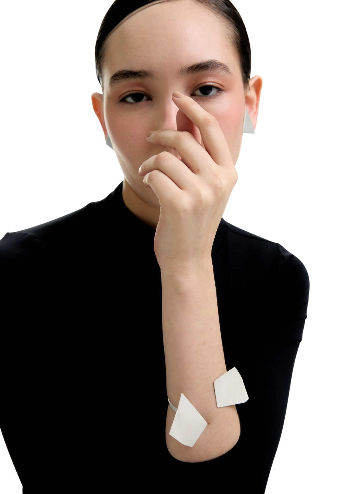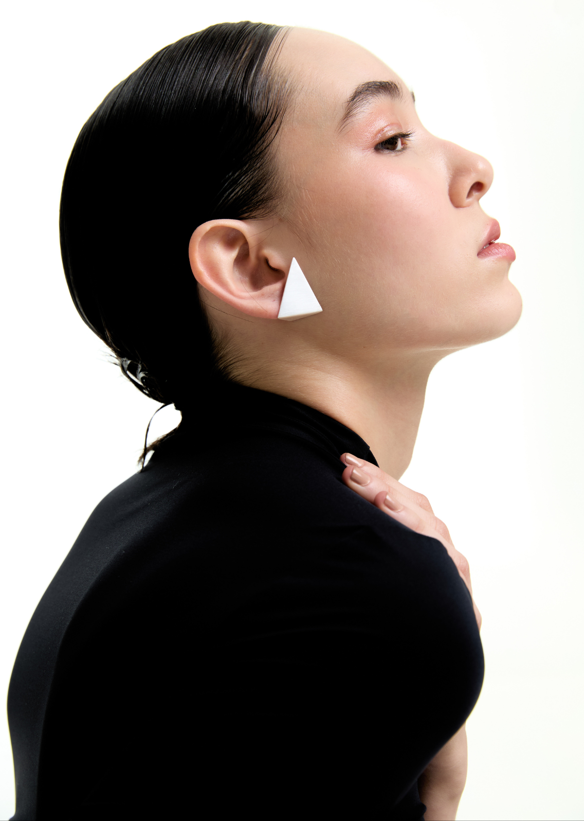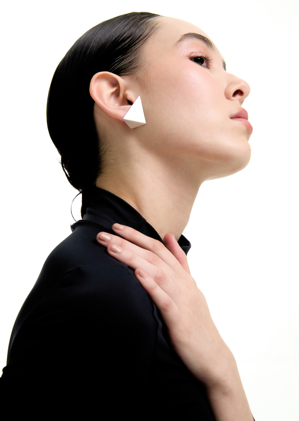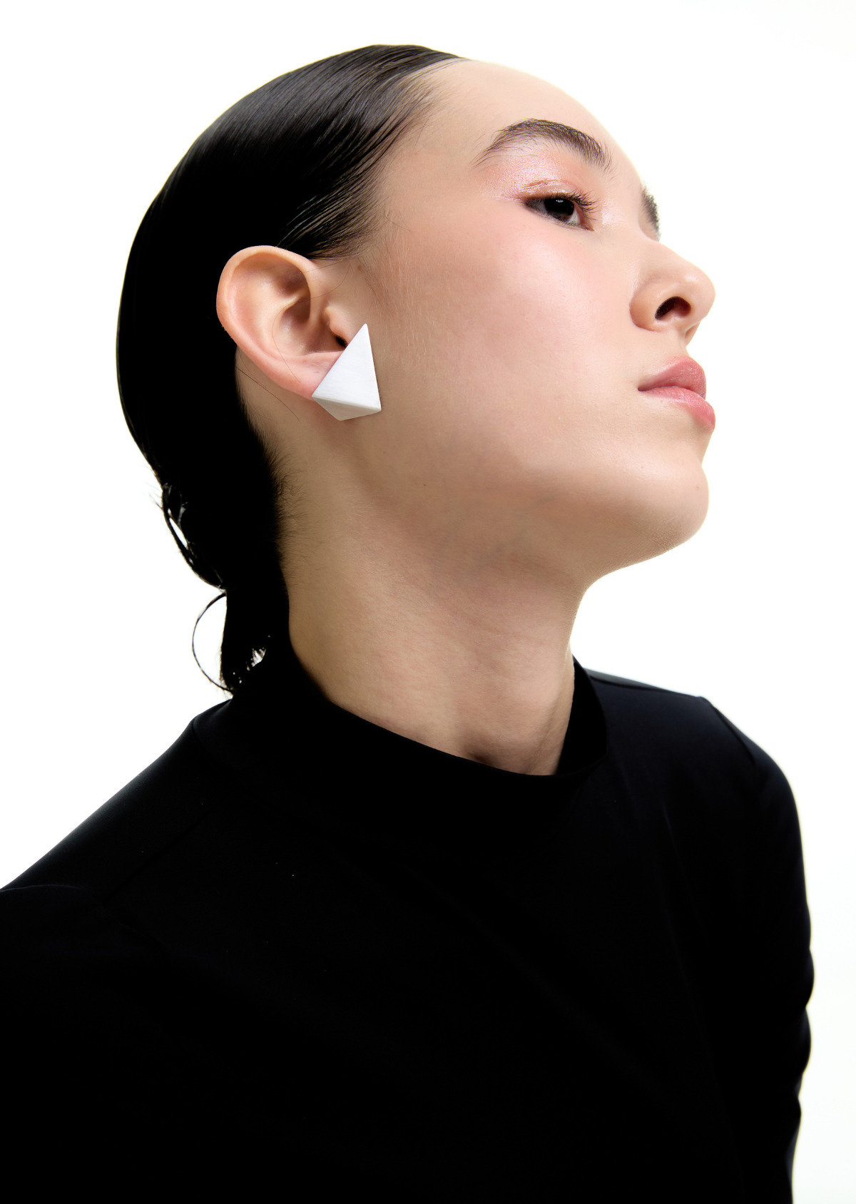 Brinco geométrico e impactante feito em prata 950, a partir de uma chapa única com uma dobra que 'abraça' o lóbulo da orelha, formando uma estrutura semelhante a um prisma triangular. Pinos e tarraxas de prata. O brinco integra a linha Vértice e pode ser complementado pelo colar Vértice Fragmentos,...