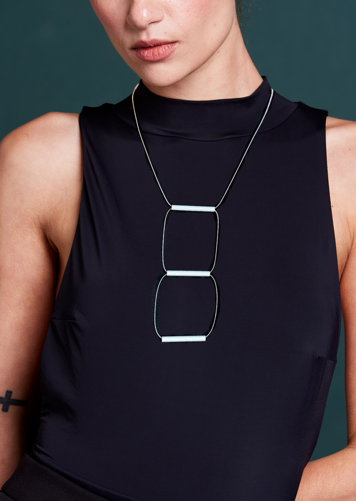 Colar ultra-leve e intrigante feito de um fio flexível de aço e pequenos tubos de latão prateado que você pode movimentar para cima ou para baixo, brincando com as formas da peça. Na parte de trás, um tubo flexível de PVC acomoda o colar confortavelmente no pescoço. O Colar Alubrio...