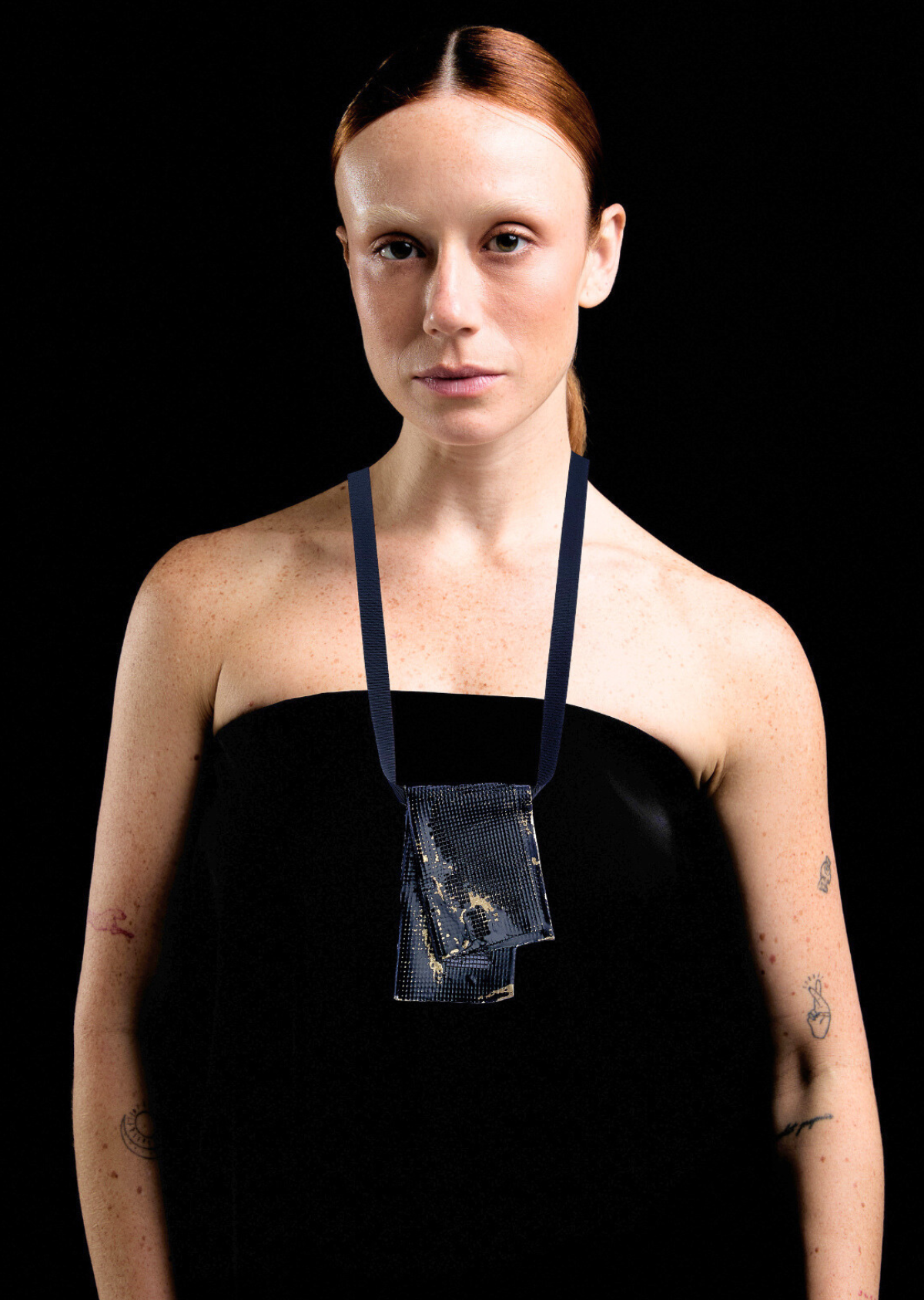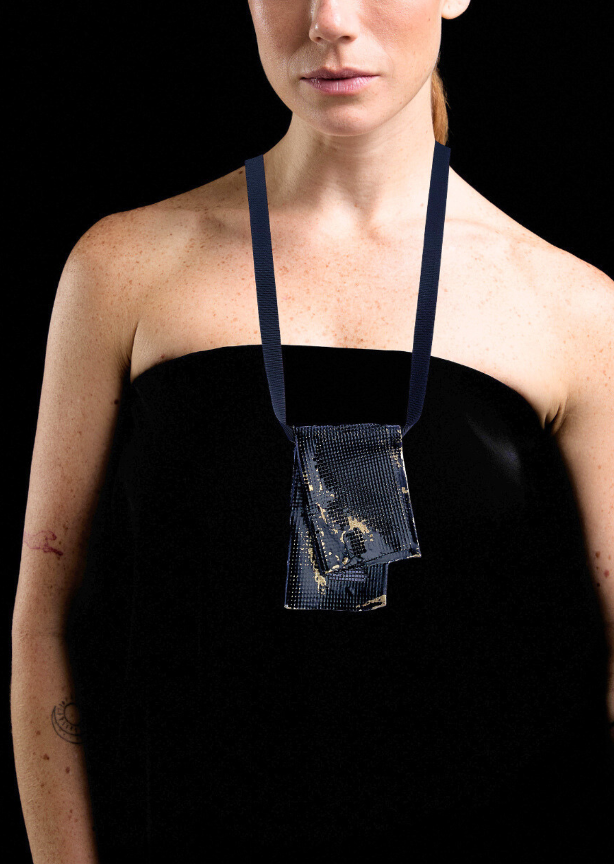 Colar longo e marcante feito em latão oxidado, a partir de uma trama de metal em fios de latão construída manualmente pela artista, moldada em tecido e preenchida, no processo de fundição, com o próprio material que em seu estado líquido 'escolhe' quais espaços irá ou não ocupar, formando um...