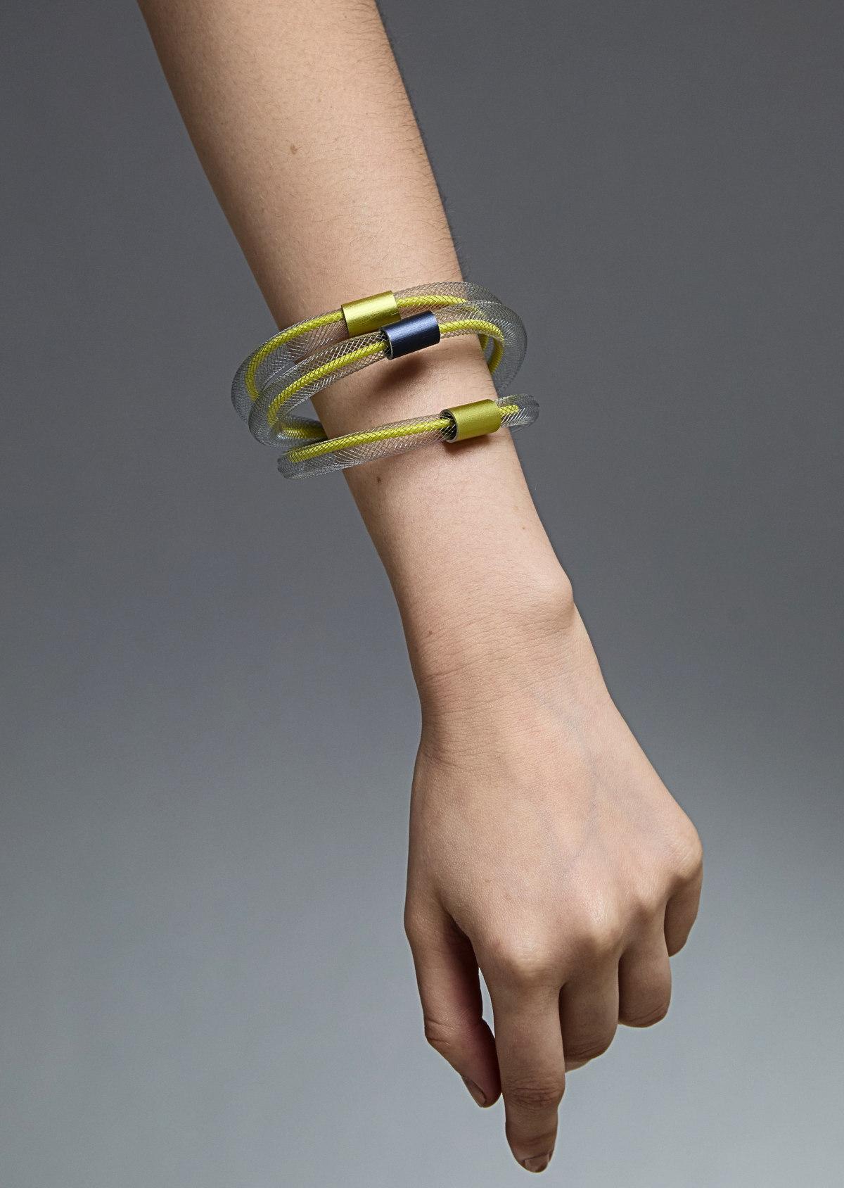 Pulseira feita em trama de PVC ultra-leve e com transparência delicada que permite ver os fios amarelo-neon no interior da trama, em um efeito intrigante. Cilindros de alumínio complementam a peça e um deles funciona também como fecho, com um ímã interno prático e imperceptível. Pode ser complementada pelo colar...